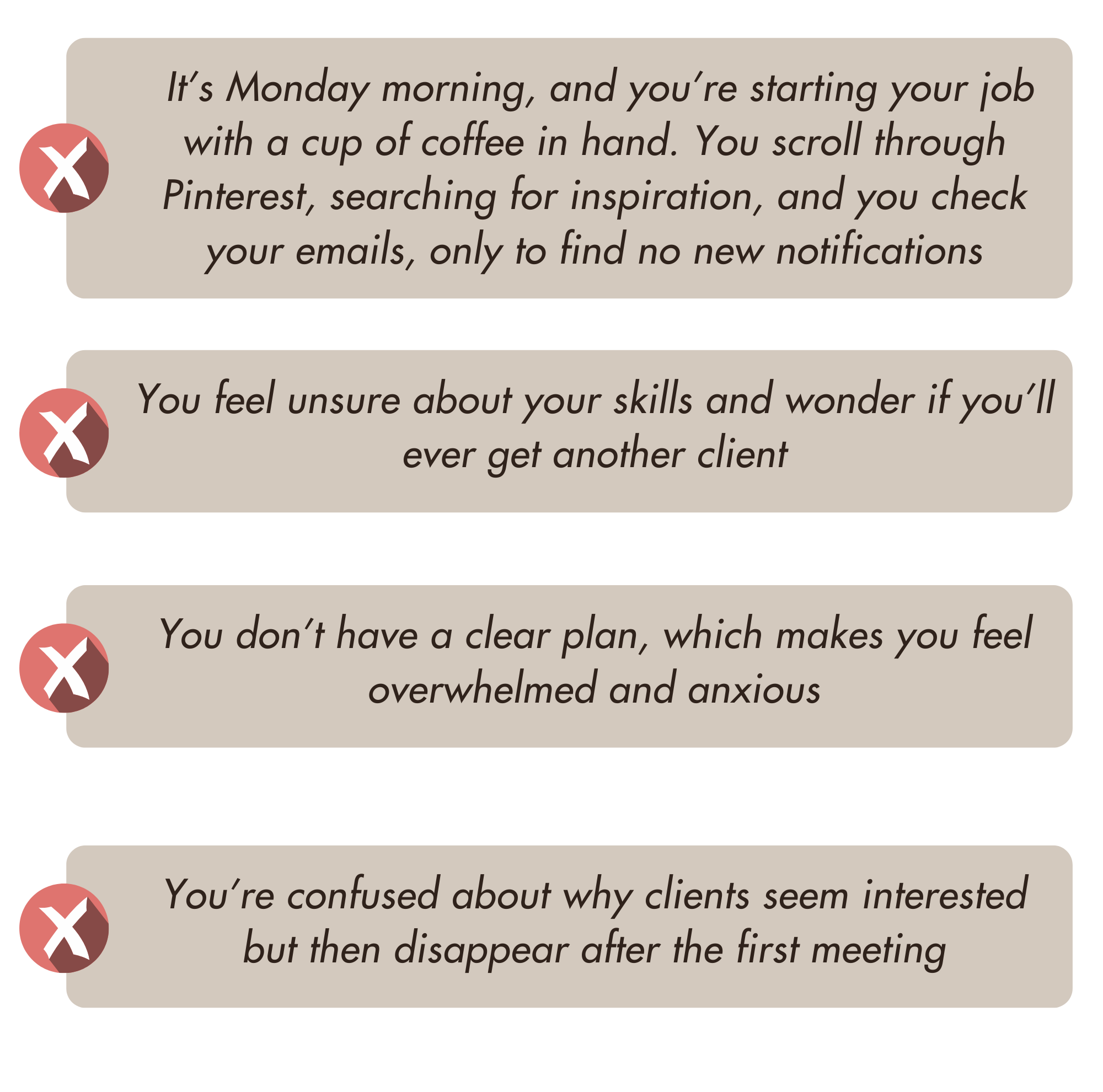 With my strategies, you’ll have a proven process to apply with each client, ensuring you’re consistently FULLY BOOKED MONTHS IN ADVANCE.