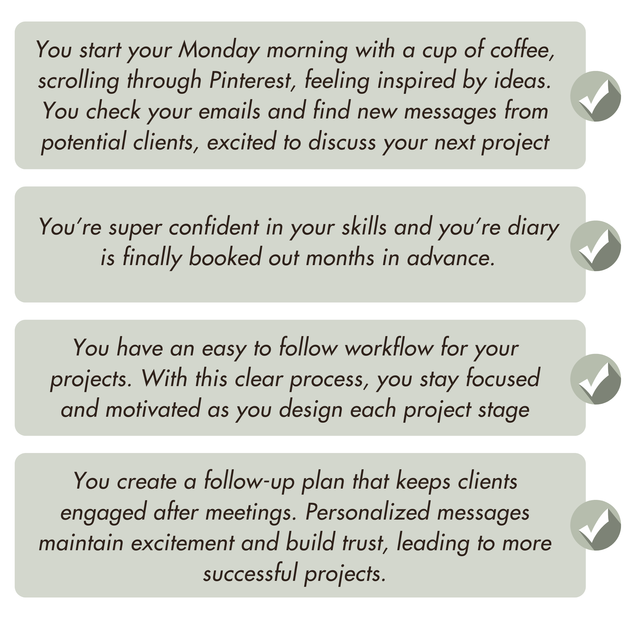 The follow up: "Yes, I won this client!" or "They’re still thinking..." — either way, you’re covered with ready-to-use email templates and follow-up strategies. Enough of guessing how to build trust with your clients! Feel more in control by knowing exactly how to follow up confidently, keeping the momentum going and showing clients that you genuinely care.