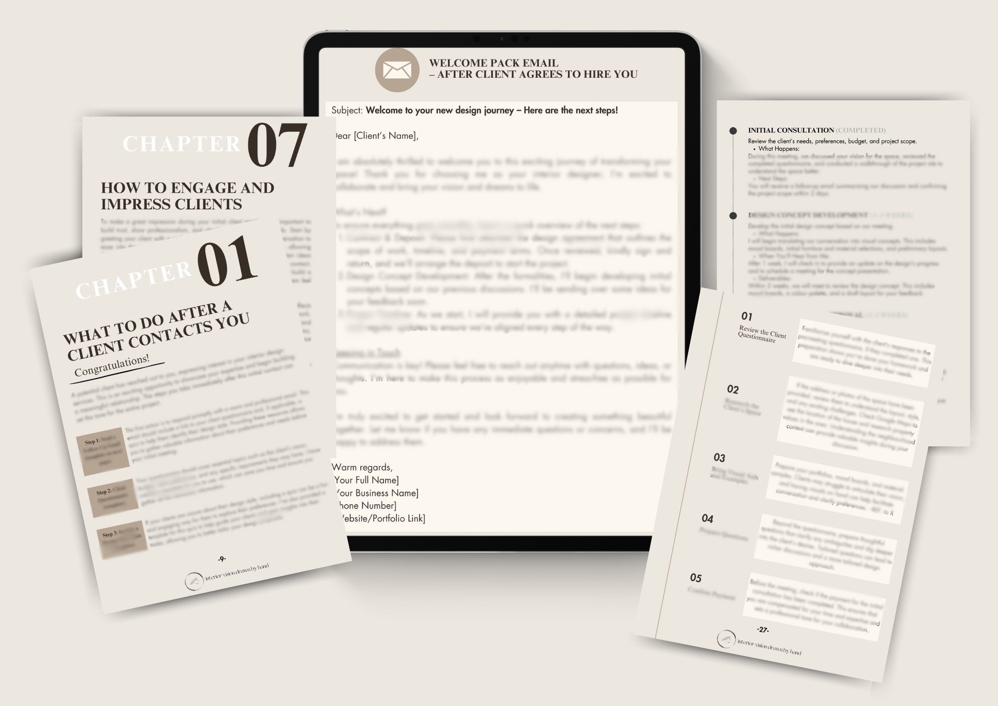 This bundle contains a comprehensive client questionnaire, an interior style quiz for clients who aren’t sure of their preferences, email templates, meeting preparation tips, follow-up strategies, and a detailed project timeline. It's designed to take you through the entire client process—helping you secure and retain clients while building trust and credibility.